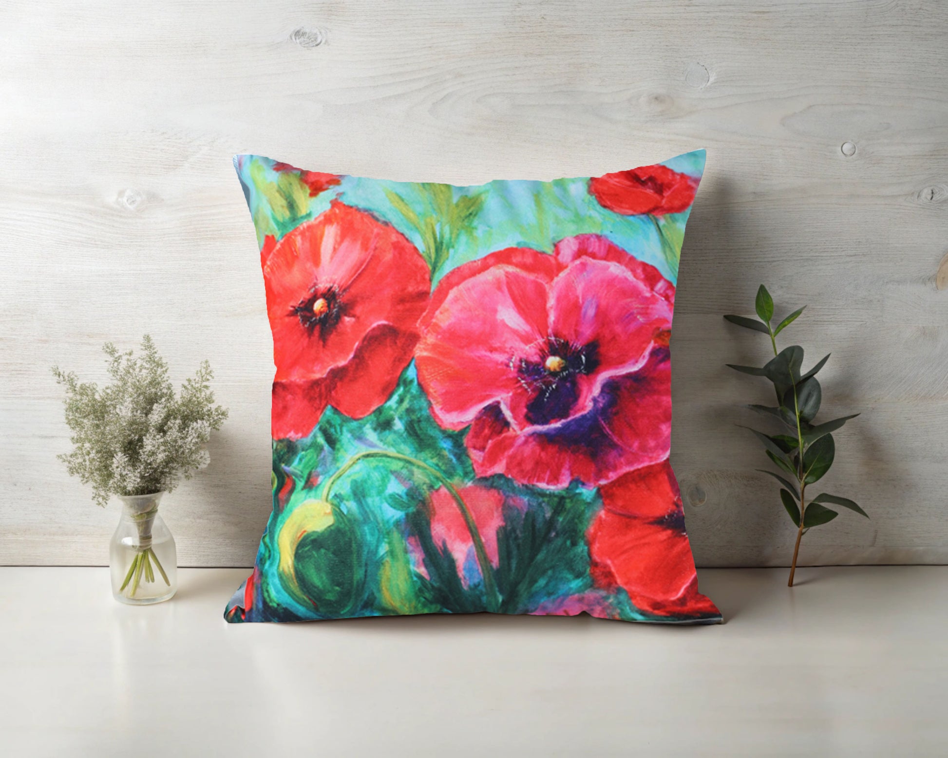 Pink and Teal Poppies Velvet Cushion (Single Sided)
